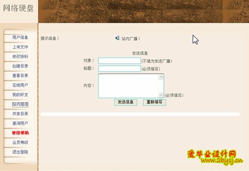 (1)用户注册模块:注册包括,名称,密码,OICQ,邮箱,性别,年龄等基本信息,填好后保存至用户数据表。 (2)用户登陆模块:已经注册好的用户进入该系统,必须先进行注册,否则以游客进入系统。(3)用户信息:当以注册好的用户名进入系统,将显示用户的具体注册信息。(4)上传文件模块:将文件保存至指定的位置。(5)创建目录:将创建一个文件。 (6)查看目录:可查看文件的相关信息。(7)共享目录:作为公共资源与其他用户使用。 (8)在线用户:可以浏览当前在线的用户人数及信息。 (9)我的好友:可以查看好友的基本信息。(10)站内短信:可以接受相关信息。 (11)使用帮助:用户可以得到相关的信息 。 (12)退出登陆:返回登陆界面。