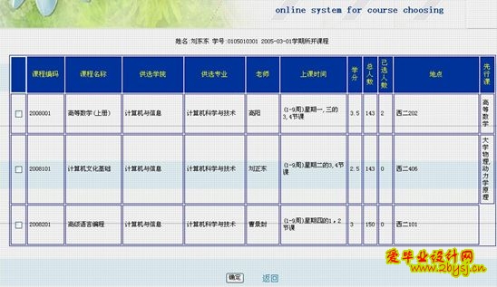 信息浏览:信息浏览包括已选课程浏览、被选课程浏览、公共信息浏览、已发布课程信息浏览。已选课程浏览是为学生提供的查看自己已经选择的课程信息,根据选择的学期不同而更新页面。被选课程浏览用于学生修改、补选、重新选择课程。公共信息浏览适用于教师和学生查看最近发布的信息(内容、时间)。已发布课程信息浏览用于各代课老师查询自己已经发布的课程信息,主要用于浏览、核对。