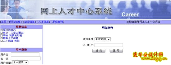 本系统以asp为主要制作工具,实现了用户注册、登陆、验证身份及用户数据的采集、个人简历的预览查询、搜索/查看用户信息,站内最新工作信息发布,可进入留言本留言从而实现了网站与客户之间的交流和沟通等。