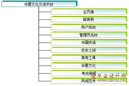 华夏文化交流平台包括两个模块:文章管理系统和留言板。其中文章管理系统包括文章浏览、网站公告浏览、后台登录、公告添加、文章管理、帐号管理等子模块。留言板包括发布留言、观看留言、后台管理等子模块。另外主页面提供本网站的一个宏观样式,并让各模块与之配合联系,就构成了一个完整的网站系统。