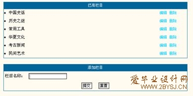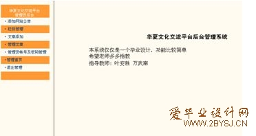 4、管理员后台:管理员后台登陆、公告添加、管理员文章管理、帐号管理等子模块的综合。其中管理员文章管理子模块有文章栏目管理、文章添加、文章编辑和删除等功能。(爱毕业设计网 www.2bysj.cn)