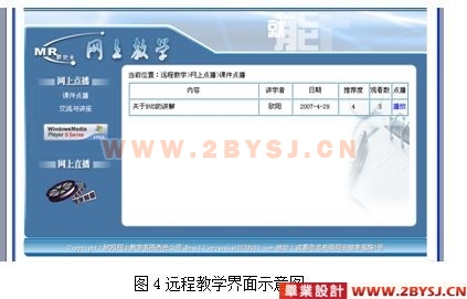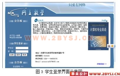 本系统采用B/S模式,使用asp作为开发语言,用SQL Server 2000开发后台数据库。本系统分前台管理和后台管理两部分。前台管理主要实现以下功能:学生网上注册个人信息;学生在线查询资料;在线视频学习;在线考试可以随时检测学生的学习情况;在线论坛可以收集学生的疑难问题和在线交流;公告栏可以时事的显示最新的消息。强大的后台管理主要实现以下功能:可以对学生资料的查询与删除;对课程相关资料的添加、删除、修改等;发布新的公告。此论文详细介绍了系统的需求分析,系统设计和具体实现。最后,以图的形式给出测试结果。