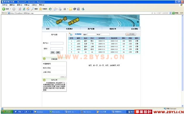 火车售票系统是典型的电子商务销售平台, 其开发基于B/S模式的网上销售的实现,采用的是asp +sql 2000模式。电子商务是凌架于互联网系统上的一个销售平台,是地面销售系统的一种延伸和互补,也是商家和顾客的一种很有效的沟通途径。当下在中国,不同程序实现网上销售的厂商约占78%左右,剩下的那22%左右的厂商,都在努力创造着做网上销售的地面物质准备。錾于此,实现网上销售,已经成为未来商场战争中占有优势地位的必不可少的工具了。