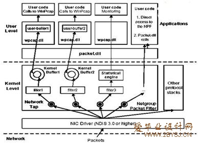 WinPcap 是由伯克利分组捕获库派生而来的分组捕获库,它是在Windows 操作平台上来实现对底层包的截取过滤。WinPcap 为用户级的数据包提供了Windows 下的一个平台。WinPcap 是 BPF 模型和 Libpcap 函数库在 Windows 平台下网络数据包捕获和网络状态分析的一种体系结构,这个体系结构是由一个核心的包过滤驱动程序,一个底层的动态连接库 Packet.dll 和一个高层的独立于系统的函数库 Libpcap 组成。底层的包捕获驱动程序实际为一个协议网络驱动程序,通过对 NDIS 中函数的调用为 Win95、Win98、WinNT、和 Win2000 提供一类似于 UNIX 系统下 Berkeley Packet Filter 的捕获和发送原始数据包的能力。Packet.dll 是对这个 BPF 驱动程序进行访问的 API 接口,同时它有一套符合 Libpcap 接口(UNIX 下的捕获函数库)的函数库。