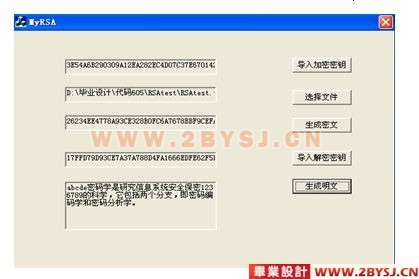 1、对于软件运行所需要的加密和解密密钥,使用其他的工具来产生,并存入在本机的文本文件中。由于RSA的实现是一个很复杂的过程,不论是系统参数选择(即加密解密时使用的密钥的产生),还是加密解密运算,都是很复杂的过程。故在本次设计中,我们只考虑RSA的加密解密的实现。