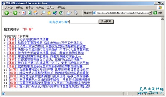 新闻搜索引擎是从指定的Web页面中按照超连接进行解析、搜索,并把搜索到的每条新闻进行索引后加入数据库。然后通过Web服务器接受客户端请求后从索引数据库中搜索出所匹配的新闻。