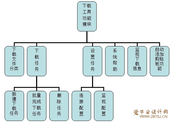 通过对多线程断点续传下载软件的需求分析并结合实际情况的分析,本系统由下载分类管理、任务管理、设置管理、系统帮助四个主模块构成。本系统的功能结构图如图示: