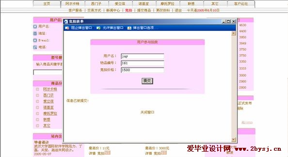 这个网上拍卖平台系统就是CtoC电子商务的一种形式,主要是分析网上消费在消费者和消费者之间发生的交易过程,网上拍卖网站则是为这一过程的提供平台,该平台可供消费者录入需要卖出的商品信息和买卖的形式和具体要求,系统对这些信息进行管理,并以页面的形式分门别类的发布,供其他消费者浏览查询选购和竟拍,并提供网上交易费用代收等服务。