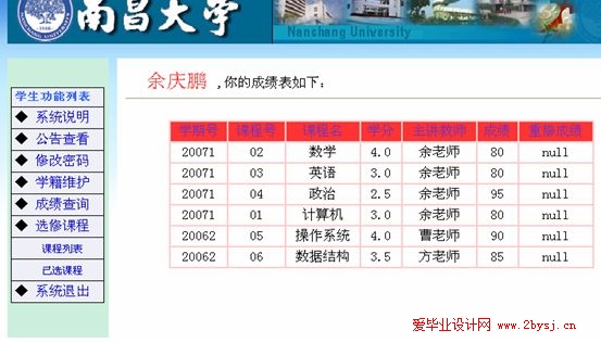 This system uses the B/S pattern to carry on the development; the system user jurisdiction has two kinds: The student and the system manager, the different jurisdiction user records to the different operation contact surface. This system mainly by the school register maintenance, chooses function module and so on class management, result inquiry to be composed, this article specifically introduced various functions module contains the small module function, the school register maintenance module mainly is carries on the increase, the inquiry, the revision, and the deletion to student's basic information; Chooses the class administration module mainly is to the curriculum which takes as an elective carries on the increase, the deletion, the statistics takes as an elective the population, as well as the student carries on chooses the class and re-elects the class; The result inquiry module mainly carries on the increase, the deletion, the input result to the required course, as well as the student carries on function and inquiry result and so on.