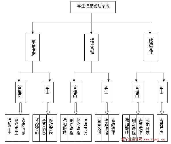 学生信息管理系统主要提供方便高效的管理功能以及网上的信息查阅平台,学生可以通过该系统查阅相关信息、选课及修改相关信息,管理员可以管理所有信息。该系统使用JSP编程语言,Microsoft SQL2000数据库以及Apache Tomcat作为开发平台,运用软件工程思想方法,对系统进行快速有效开发, 系统分为以下几个方向: