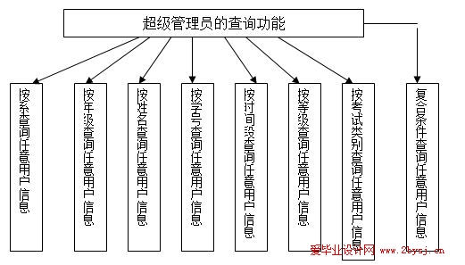 1) 超级管理员的功能:超级管理员可以对任意信息进行查询。包括按系查询、按年级查询、按姓名查询、按学号查询、按性别查询、按时间段查询、按等级查询和按考试类别查询等等。还可以进行复合查询。比如按系和按年级同时查询,那样就会列出所有符合条件的信息,然后加以选择性查询。