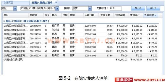 列出当前病区、诊疗组所有欠费病人信息,包括病人基本信息、住院天数、预交款情况、及欠费金额(医保病人列出现金支出差额)。