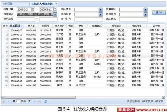 按结算日期范围、住院号、病人姓名、费别、统筹区、出院病区、科室、诊疗组、费用范围(总费用)查询已出院病人相关信息,以列表的方式显示,并可进一步查询该人员的费用明细信息。