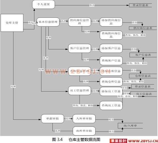 (1)基本信息管理模块:为仓库主管提供实现对客户信息、供货商信息、库房信息、员工信息的管理维护,包括对信息查询、添加、修改和删除等操作。