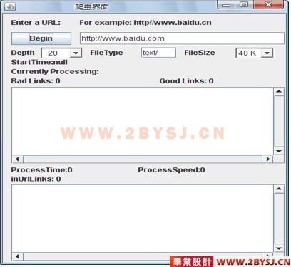 (1) 爬虫程序抓取网页:网页搜集的过程是从URL库(初始时包含用户指定的起始种子URL集合,可以是1个或多个,本程序使用1个)获得输入,解析URL中标明的Web服务器地址、建立连接、发送请求和接收数据,将获得的网页数据存储在原始网页库,并从其中提取出链接信息放入网页结构库,同时将待抓取的URL放入URL库,循环这个过程,直到URL库为空。接着把url对应的网页爬取下来。这个功能是本搜索引擎的基础,只有完成了这个功能,后面的功能模块才能顺利完成。使用这个程序时需先输入一个URL并单击“Begin”按钮,程序开始之后,“Begin”按钮会变成“Cancel”按钮。在程序扫描网站期间,会在“Cancel”按钮之下显示进度,且在检查当前网页时,也会显示相关正常链接与死链接的数目,死链接将显示在程序底部的滚动文本框中。单击“Cancel”按钮会停止扫描过程,之后可以输入一个新的URL;如果期间没有单击“Cancel”,程序将会一直运行直到查找完所有网页,此后,“Cancel”按钮会再次变回“Begin”,表示程序已停止。