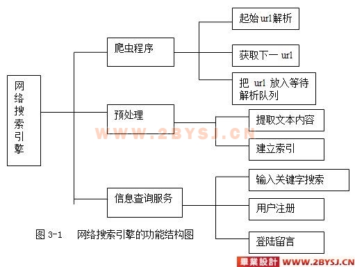 网络搜索引擎主要完成的功能有爬虫程序爬取网页;对爬取下来的网页进行预处理,建立倒排索引;用户输入关键字进行搜索能返回搜索结果。