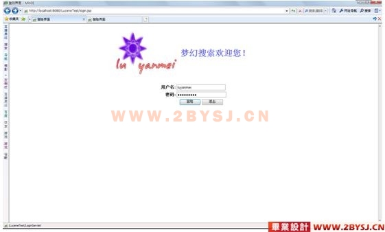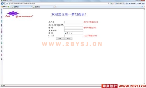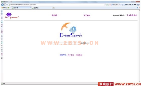 (3) 信息查询服务:这个模块采用JSP和MYSQL搭建了一个搜索平台,用户输入搜索关键字可以返回搜索结果,同时,用户还可以注册登陆留言板,对本系统提出意见或建议。使用这个程序只要正确输入索引的路径,即可正确实现本模块的功能。