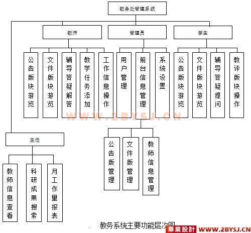 教研室教务管理系统是位于高校教务管理系统之下的子系统。高校教务管理一般采取二级管理模式,即校级教务处和院(系)教学管理办。校教务处侧重于对数据的维护和管理,以及从整体的角度进行数据分析和数据统计;而院(系教学管理办则侧重于数据的录人、查询、打印,以及从局部的角度进行数据分析和数据统计等。院(系)教务人员通过校园网访问放置在教务处的数据库服务器,可远程地进行数据的录人、删除、更新、查询等操作;院教务处则可根据从网上汇总上来的数据进行各种统计等处理;部分公共信息可在校园网、Internet上发布,用户可通过浏览器从教务处数据库中获取相应的动态信息。