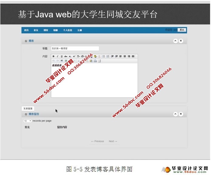 交流模块的功能主要就是提供好友之间在线的聊天功能。博客模块可以让用户发表包含图片文字的博客,博客还支持好友的浏览、评论、留言。用户还可以对其进行查询,便于找到需要的内容。相册模块除了拥有博客的所有功能外还添加了一个设置访问权限的功能,用户可以对此模块中的内容进行加密或者允许特定好友进入,这确保了用户的个人隐私问题