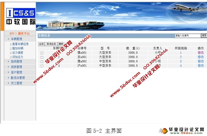 车辆管理:总公司负责车辆的购买、维护和运力调配。能够增加、查询、修改和删除车辆的信息。在货物体积或重量超载时可以使用多辆车,但每辆车只有空闲时可以安排。