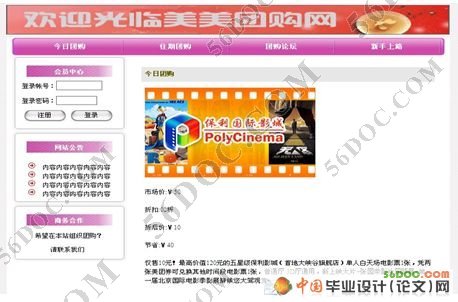 摘 要网络团购是消费者为满足其特定需求, 利用互联网平台便捷性的特点, 自发组团、信息共享, 共同采购, 以降低交易成本和交易风险, 获取产品价值最大化的一种理性行为。目前, 网络团购在国内主要以同城团购为主, 即发起人在网上召集有共同购买意愿的团众, 在线下组织见面交货。本系统主要设计B/S模式的