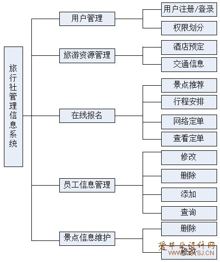 用户管理:用户身份有两种,即普通用户和系统管理员。普通用户只能进入基本的系统界面,即旅游资源管理和在线报名管理,进行旅游资源等各项信息的查询和在线报名;若为系统管理员,则直接进入本系统的完整界面,即旅游资源管理、在线报名管理、员工信息管理、景点信息维护等四个模块,可以进行基本信息的查询、修改、维护等。(论文所有权:爱毕业设计网www.2bysj.cn)