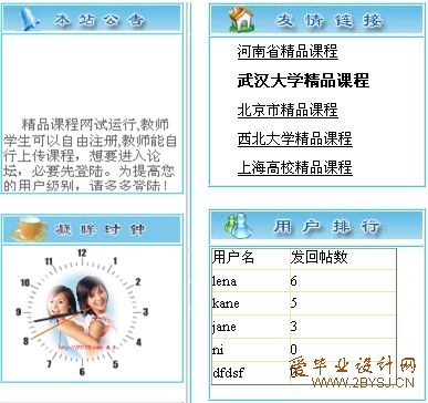 > 系统管理:主要实现对网站的动态维护,可以对用户,课程,帖子,公告进行管理。包括查看、添加、删除、修改等功能。