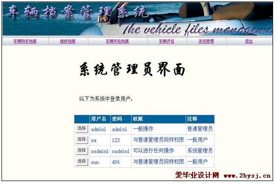 进入车辆档案管理系统,首先,选择用户身份。如果是普通管理员身份,则可以进行车辆购车档案,维修档案,车辆年检档案的各种操作,也可以进行车辆评估。如果是系统管理员身份则不但具有普通管理员的权限,还可以查看系统中所有登录用户的信息。如果用户名和密码正确则可以进入到欢迎界面,通过功能菜单进行相应的操作了。