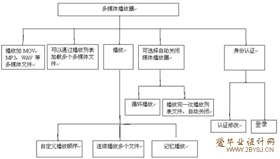 设计的功能主要分四大子模块:文件加载、播放、关闭、认证。文件加载是由打开和添加两个子功能模块组成。播放包括自定义播放顺序、连续播放多个文件、记忆播放三个子功能模块。自定义播放顺序则是由上一首、下一首、暂停/播放、停止、播放列表等子功能模块组成。关闭是由循环播放和播放一次就关闭两个子功能模块组成。身份认证是由登陆和修改认证两个子功能模块组成。