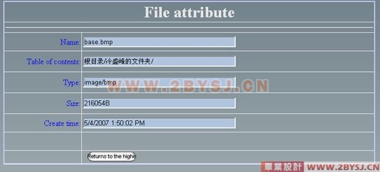 用户在使用系统时,光看某一个文件的名字有的时候并不能判断出这个文件是否是他所需要的,所以在系统中添加了查看文件属性这个功能块。当用户点击文件名,并由文件的链接进入查看文件属性页面,在页面中显示了文件的名字、所在目录、类型、大小和创建时间。