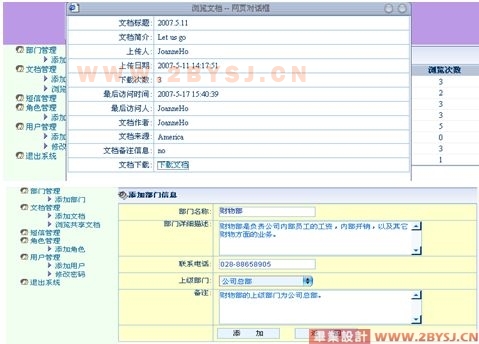 5. 部门管理:对部门进行添加,修改,删除等操作。由于公司或企业内部有多个部门,多个部门又分别有附属的上级部门,部门之间也会涉及到对文档的处理。