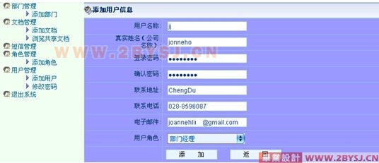 3. 用户管理:对不同用户身份登录,对用户管理功能的操作权限不同。若为管理员身份,能对用户的进行添加、删除、修改管理员个人的密码、修改管理员自身及其它用户的相关信息的操作。若为普通用户登录,就只能对用户自已的密码及个人信息进行修改。
