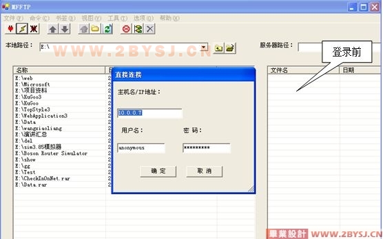 用Visual Studio.NET2003开发FTP客户端软件。根据现有的FTP软件进行设计与实现。综合以前所学的相关知识:包括计算机网络技术、TCP/IP详解、信息安全相关知识等;查阅Windows应用程序开发资料,学习C#语言,FTP通信过程。