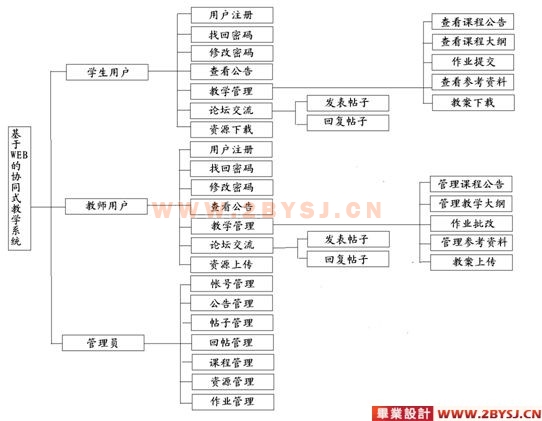 系统实现是基于WEB的协同式教学系统,为学生和老师之间提供一个交流互动的平台。打破以往传统的仅靠现场讲课来实现教学任务的模式,使学生能够更具自己的兴趣和爱好有选择有方向地进行学习与交流。本系统主要实现的功能模块有: