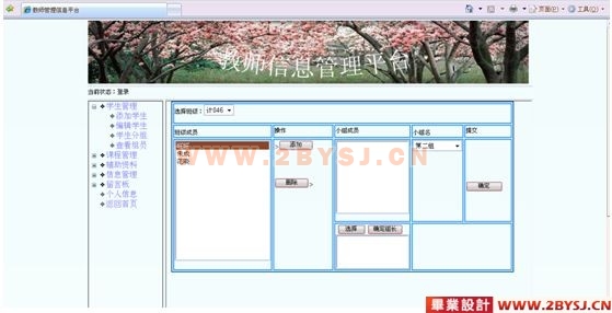 学生信息管理主要包括学生信息维护和学生成员分组两部分。学生信息维护主要包括对学生的添加、编辑、删除等;学生成员分组主要包括创建小组、对已有小组成员管理,包括添加、组长设定等。