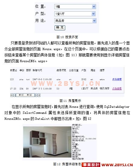 本房屋销售信息管理系统可以显示各种房屋的基本信息和通告信息。用户可以对自己喜欢的房屋进行预订,产生预订单,可以通过网上留言与管理员沟通,并且可以使用搜索功能快速找到自己感兴趣的房屋。系统管理员通过管理界面可以添加、删除和编辑房屋信息和通告信息,还可以对注册用户进行管理。本系统的最终目的就是加强用户和销售方的沟通,促进房屋销售。