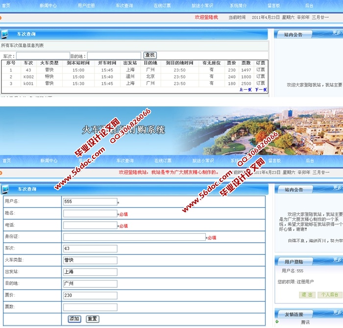 火车票在线订购系统的设计与实现(asp.NET,SQL)(含录像)(毕业论文12000字,程序代码,SQLserver数据库)