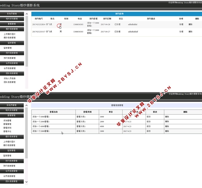 论文阐述了Wedding Story婚纱摄影系统的开发过程,并对该系统的需求分析及系统需要实现的设计方法作了介绍。该系统的基本功能包括网站前台信息展示和管理员后台信息管理。前台网站包括套餐查询,新闻资讯,企业介绍信息等;管理员系统包括管理员登录,套餐管理,婚纱图片管理,团队信息管理,新闻管理等功能。