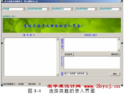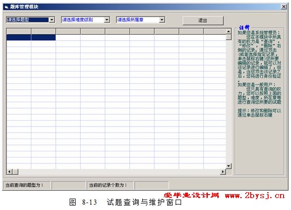 u 信息管理子模块主要包括:试题类型的增加、试题信息和章节信息的录入、编辑、查询三个子模块。具体可以实现信息的录入、修改或删除题库、浏览题库、增加题型和章节、修改难度系数和查询当前题号、试题个数、章节信息等功能。试题库是试题来源,对试题库进行管理非常重要。试题录入时可集中录入或随时录入;对于录入的试题在一定的权限下可作修改或删除;在浏览题库时可查看已建立的试题库,并对其进行分类统计;对不同的课程可增加新的题型和新的章节;可修改题目的难度系数。