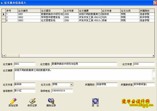 但结合本人目前实际情况而言,单位的人员结构比较简单,部门划分也很清晰,而且人员的流动性不高,所以单位目前阶段的文档工作主要就是员工档案的收集整理和文档的管理工作,因此,针对该公司而言,经过反复的论证,设计的这套毕业论文管理信息系统,定义了档案的建立、维护和灵活查询;考勤记录和毕业论文管理;系统维护等功能。