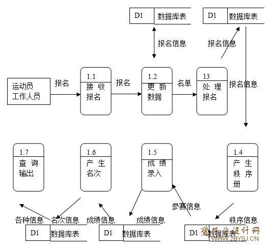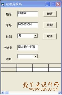 运动员报名:运动员报名是把运动员信息和该运动员要参加的比赛插入表中,修改运动员的参赛项目和删除运动员。运动员报名时如果运动员名单中没有此运动员,则把此运动员姓名插入运动员名单中且把该运动员参加的比赛项目插入参赛情况表。如果此运动员存在而又没有选择输入的比赛项目则只要把该比赛项目插入参赛情况表中,否则提示已经选择该比项目。