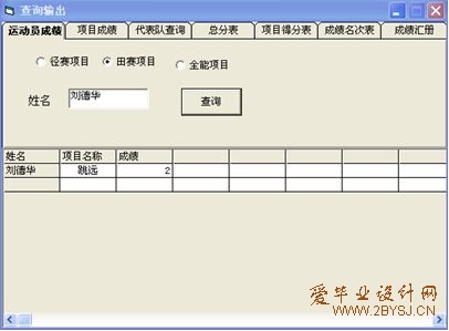 学校田径运动会管理系统是典型的信息管理系统,本系统为田径运动会运动会组织者提供方便、快捷的方法,系统的对运动会进行合理的安排与管理,实现无纸化工作,节省大量人力和物力。本论文首先使用了Visual Basic作为开发工具和Access作为后台数据库,然后再介绍了开发背景,最后通过截图和表格来说明该系统的开发与操作。设计充分利用VISUAL BASIC以及ACCESS数据库易于使用和快速开发的特性,提高了编程效率和可靠性。同时对系统的开发原理、系统的功能特点和设计方案进行了介绍。在对运动会管理体系进行充分分析和系统论证的基础上开发。它不但能完成运动会管理中的基本操作,而且具有程序设计合理、操作简单、运行可靠、保密性强等特点。(所有权: 爱毕业设计网 www.2bysj.cn QQ:306826066)