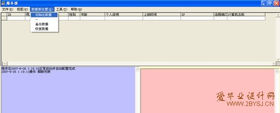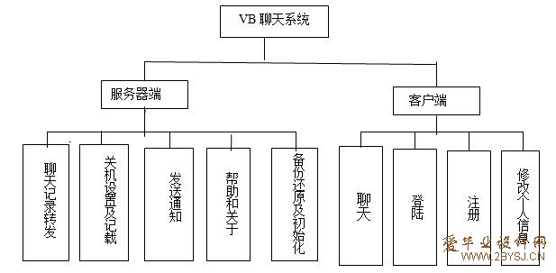 根据上述聊天软件的需求分析,并针对个人所掌握的知识和自己毕业设计时间的限制,要做到面面具到是不可能的。所以考虑到作为局域网(校园网)聊天工具,终端用户数量较少,本VB的多功能聊天软件借鉴了QQ、聊天室等及时聊天工具,聊天信息采用服务器转发方式,只要当前在线的用户都可以接收到,当然,也实现了两人之间的私聊功能。包括服务器程序和客户端程序,服务器包括聊天信息即时转发,自动关机的设置及记载,发送通知,数据库备份还原及数据库的初始化。客户端具有登陆,注册,修改个人信息,聊天等功能,功能比较简单,可实现聊天功能。(所有权: 爱毕业设计网 www.2bysj.cn QQ:306826066)