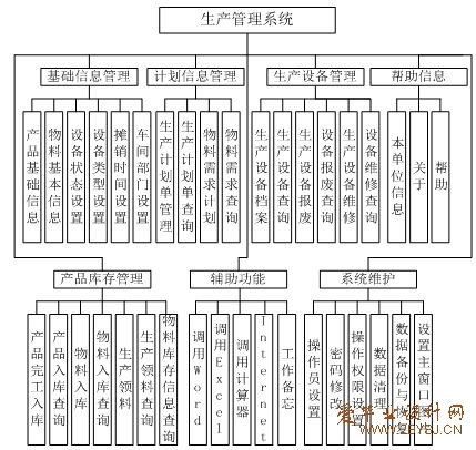 生产管理系统是一个典型的数据库开发应用程序,由基础信息管理模块、计划信息管理模块、生产设备管理模块、产品库存管理模块、辅助功能模块、系统维护模块、帮助信息模块7个功能模块组成,规划系统功能模块如下: