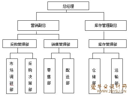公司的组织结构主要由总经理、营销副总、库存副总、采购部、采购管理部、销售管理部、库存管理部、存货核算部门组成。(爱毕业设计网 www.2bysj.cn)