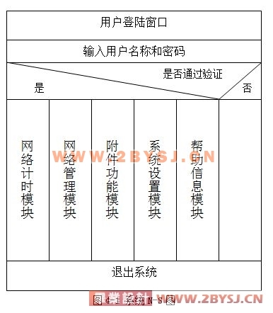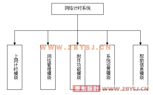 本系统整体由上网计时,网络管理,附件功能,系统设置,帮助信息等,五大部分组成。每一部分中又分若干子模块,实现不同的功能。