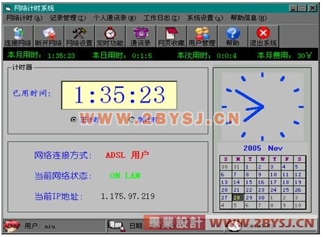 使用ADSL上网的用户,若要想了解自己的上网用时和上网记录,每次必须登录到网通的客户计费查询系统,费时,费力,极为不方便。对于使用Moden上网的用户,如果想了解上网用时,那就是更为复杂的事情了。为了方便,快速,准确的了解上网用时,合理分配上网时间,引入了该系统。