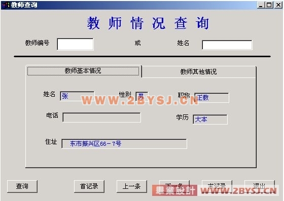 功能:(1)、查询模块:对教师情况,班级情况,课程表,教师工作量,教学计划的查询。其中,教师情况可以查询教师的个人情况及其学历等等;班级情况可以查询班级的人数,男,女生人数及指导教师等情况;课程表可以查询每个班级,每个学年度的课程情况;教师工作量模块可以查询每个教师的授课及其它工作的情况;教学计划模块可以查询各科课程的安排情况。