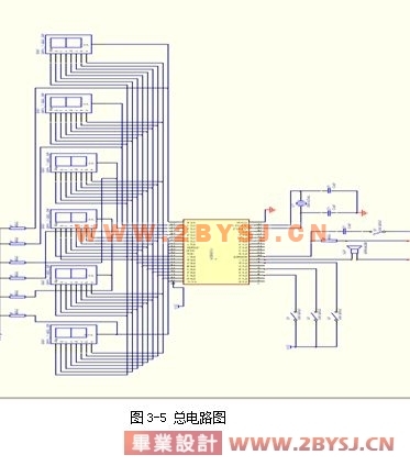 整个系统分为几个小的电路,分别实现各自的功能。晶振电路,12MHZ晶振和两个30pF电容构成并连谐振接到X1和X2口。复位电路,在RST复位输入引脚上接一10uF电容至VCC端,下接一个51K电阻到地。控制电路,4个按键控制,进行调时,定时,复位操作。显示电路,用6位7段数码管进行时,分,秒的显示。