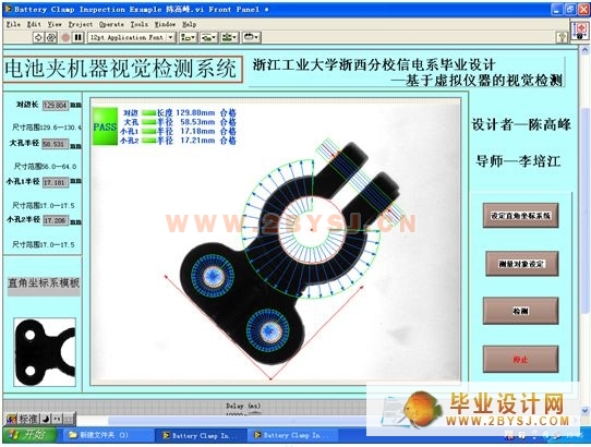本设计是关于对生产线上的电池夹的质量检测,是针对之前人为检测产生的种种误差和效率低下的缺点而提出的。而采用基于虚拟仪器的计算机视觉检测可以节约人力、物力,因此本设计采用美国NI公司的LABVIEW软件进行检测,提高了准确率和效率。(毕业设计网 www.2bysj.cn)